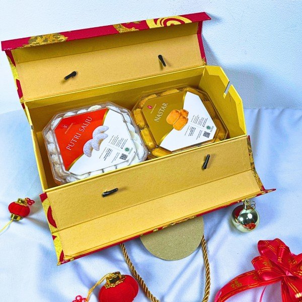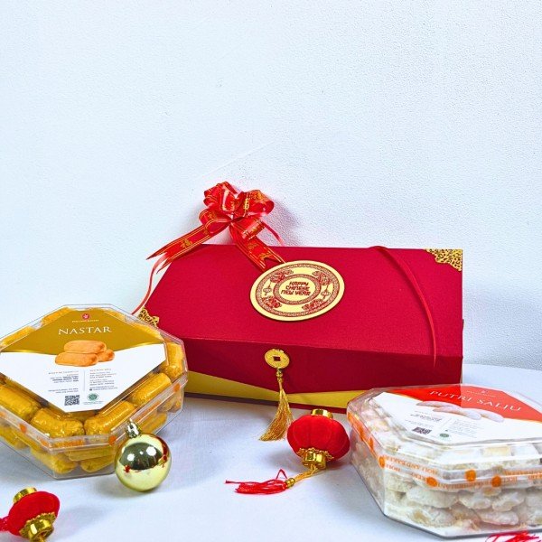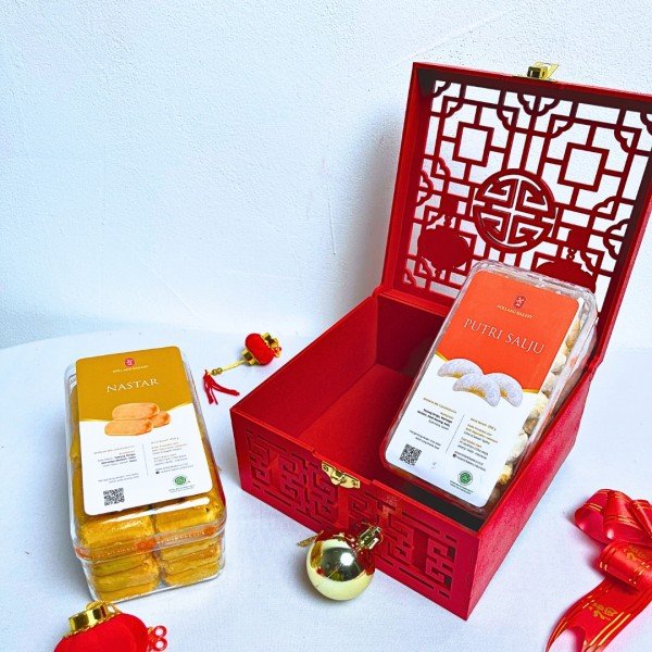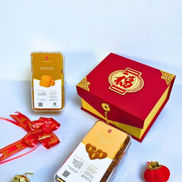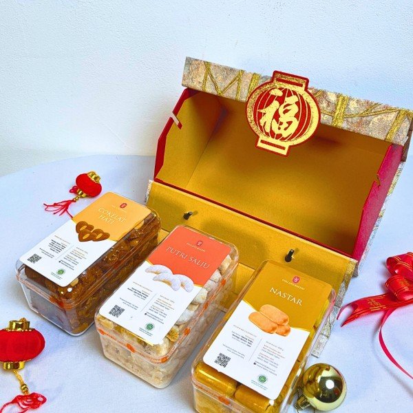 Hampers aneka cookies seperti nastar, kastangel serta putri salju yang dipadukan dengan beragam produk.